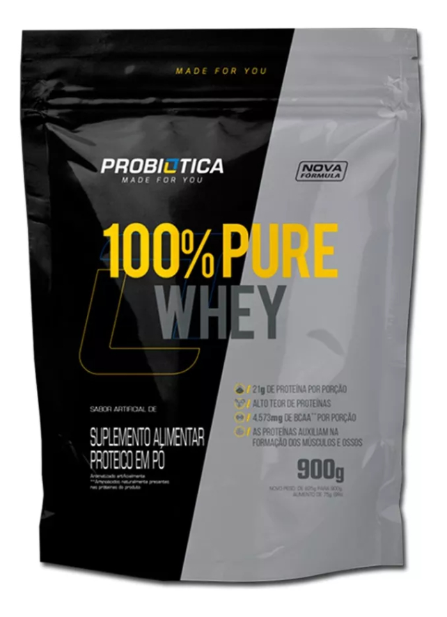 WHEY PURE REFIL 900g – PROBIOTICA 100% PURE WHEY® é um suplemento proteico composto basicamente por proteína concentrada do soro do leite (Whey Protein Concentrate), matéria-prima elaborada com alta tecnologia e elevada concentração de aminoácidos. De preparo instantâneo, 100% PURE WHEY® é indicado para ser tomado antes e/ou após os exercícios. BENEFÍCIOS -Alto valor biológico; -Coadjuvante na formação de massa muscular; -Recuperação muscular pós-treino; Alta quantidade de BCAAs. MODO DE USAR Utilize de uma a duas porções ao dia, ou conforme orientação de nutricionista ou médico; Misture todo o conteúdo de um sachê (33g) em 200mL (1 copo) de sua bebida preferida (água gelada, leite desnatado, etc). Agite bem!