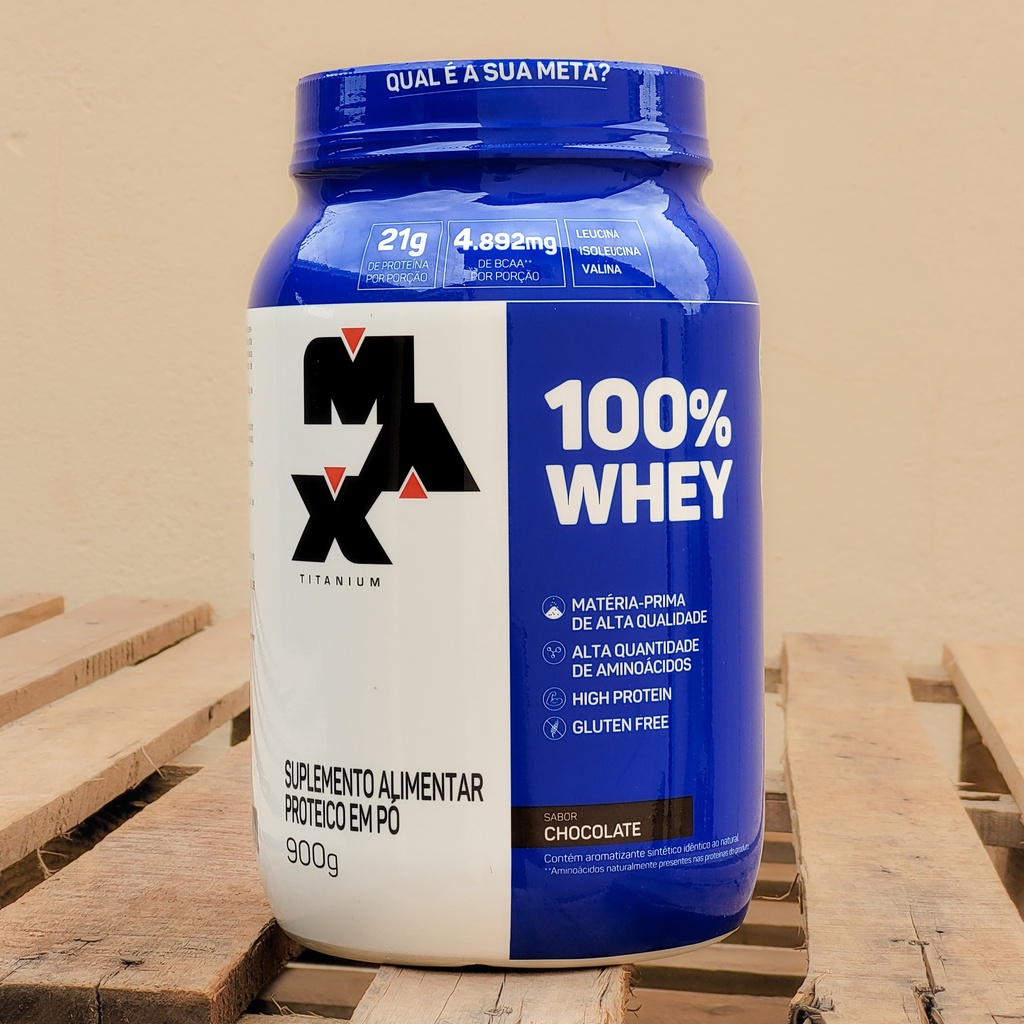 COMPOSIÇÃO DO ANÚNCIO 1x 100% WHEY POTE – 900G – MAX TITANIUM DESCRIÇÃO DO ANÚNCIO”100% Whey é um suplemento a base de proteína concentrada do soro do leite (Whey Protein Concentrate), matéria-prima elaborada com alta tecnologia, de elevado valor biológico, rápida digestibilidade e alta concentração de aminoácidos essenciais, que são fatores de relevância para auxiliar a síntese proteica muscular. O consumo de suplementos proteicos, associado à uma alimentação saudável e prática de atividade física auxilia na formação de músculos e ossos. 100% Whey fornece 20g de proteína, 4.597 mg de BCAAs e 10,1g de aminoácidos essenciais em 30g de produto.Benefícios:- Cerca de 5g de BCAA’S por dose;- 21g de proteínas por dose;- Whey protein 100% Concentrado (WPC);- 10,1g de aminoácidos essenciais por dose;Ingredientes:Morango: Proteína concentrada do soro do leite (WPC), aromatizantes, acidulante ácido cítrico, emulsificante lecitina de soja*, edulcorante sucralose e corantes artificiais amaranto e azul brilhante fcf. NÃO CONTÉM GLÚTEN. *utilizada na fabricação da proteína do soro do leite com a função de deixar o produto instantâneo (fácil diluição).Baunilha: Proteína concentrada do soro do leite (WPC), aromatizante, emulsificante lecitina de soja* e edulcorante sucralose. NÃO CONTÉM GLÚTEN. *utilizada na fabricação da proteína do soro do leite com a função de deixar o produto instantâneo (fácil diluição).Chocolate: Proteína concentrada do soro do leite (WPC), cacau em pó, aromatizantes, emulsificante lecitina de soja* e edulcorante sucralose. NÃO CONTÉM GLÚTEN. *utilizada na fabricação da proteína do soro do leite com a função de deixar o produto instantâneo (fácil diluição).Cookies and Cream:Proteína concentrada do soro do leite (WPC), cookies de cacau (farinha de trigo enriquecida com ferro e ácido fólico, gordura de palma, cacau em pó, fécula de mandioca, sal, estabilizante polidextrose, edulcorantes sorbitol e sucralose, fermentos químicos bicarbonato de sódio e pirofosfato ácido de sódio, aromatizante e emulsificante lecitina de soja), cacau alcalino, cloreto de sódio, aromatizantes, espessantes goma xantana e goma guar, emulsificante lecitina de soja* e edulcorante sucralose. CONTÉM GLÚTEN. *utilizada na fabricação da proteína do soro do leite com a função de deixar o produto instantâneo (fácil diluição).Sugestão de uso:Utilize de uma a duas porções ao dia, ou conforme orientação de nutricionista ou médico.”