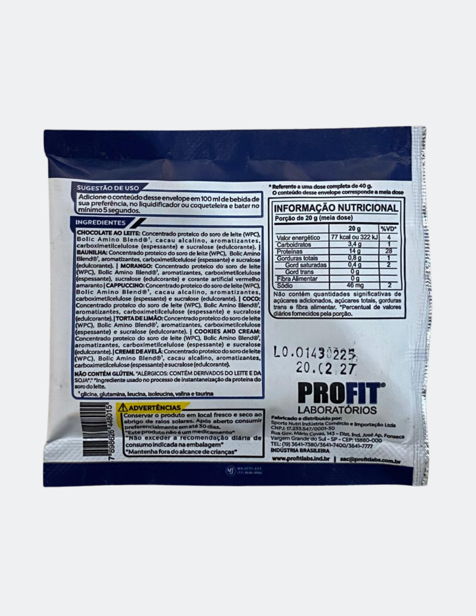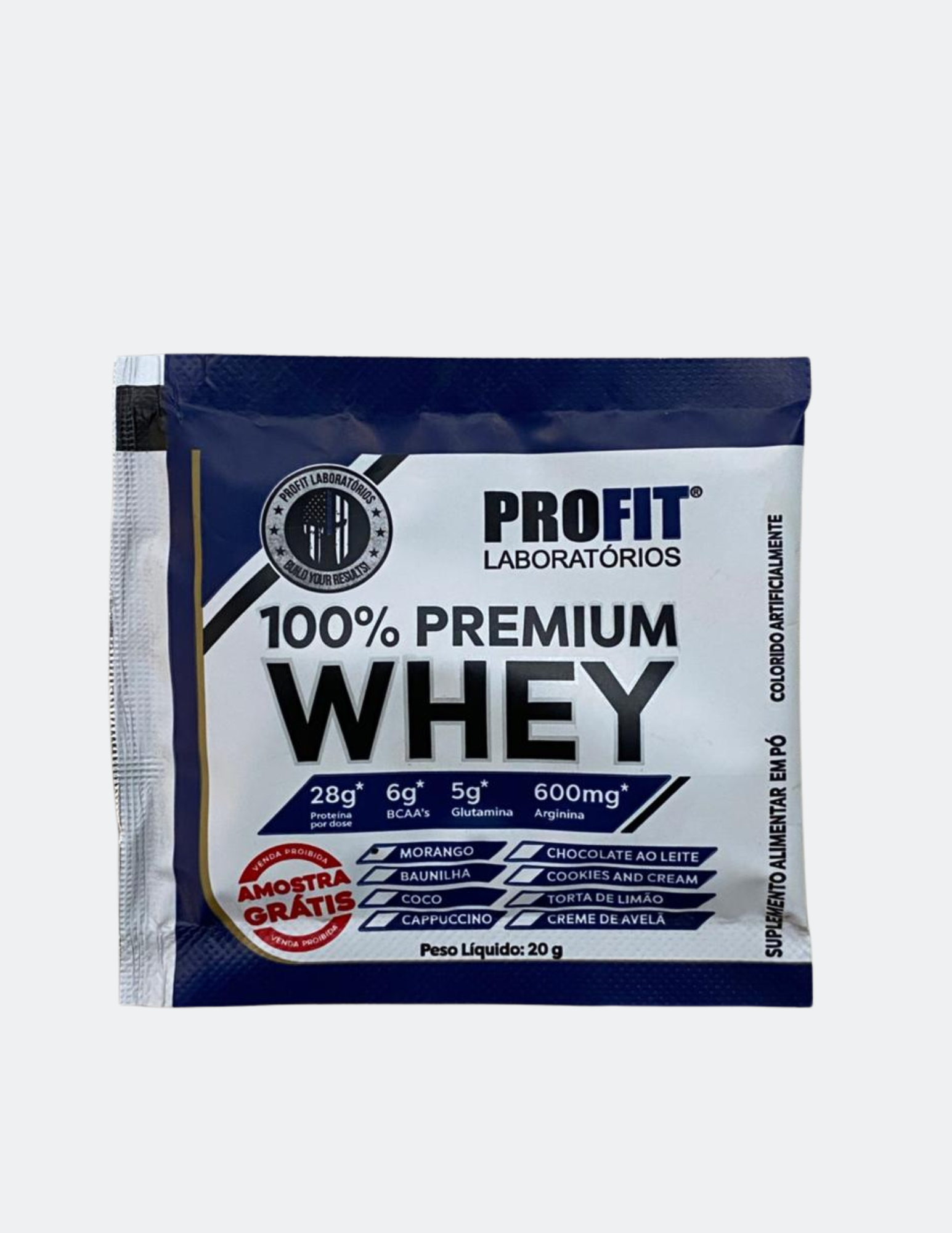 O  100% Premium Whey Protein da Profit Laboratórios é um suplemento alimentar à base de proteína concentrada do soro do leite (WPC), utilizado para complementar a ingestão proteica diária e auxiliar no desenvolvimento muscular.