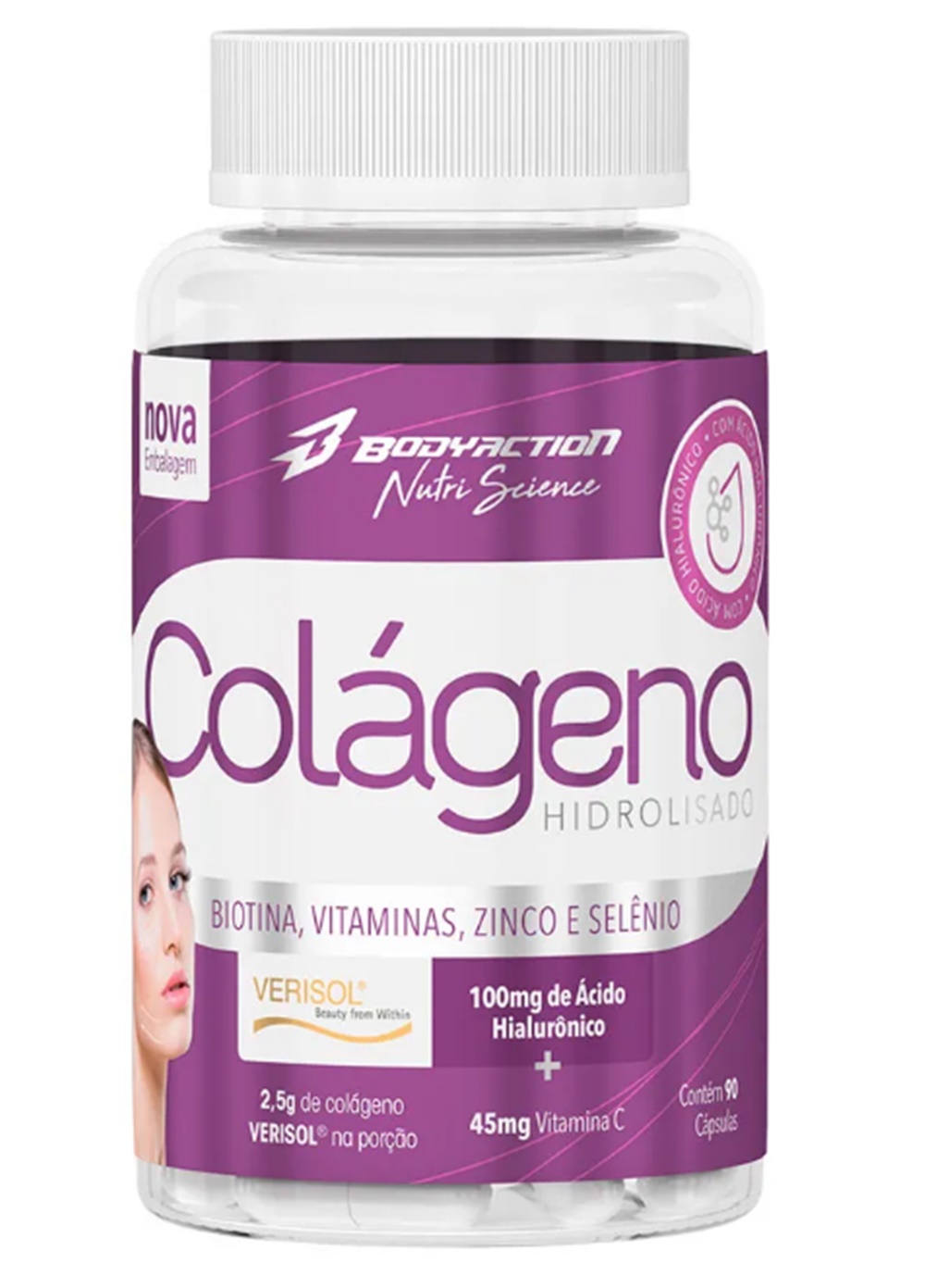 Colágeno Hidrolisado CT-I 90 caps Body Action é um suplemento à base de colágeno desenvolvido especialmente para o público feminino. O Colágeno é uma proteína que dá sustentação às fibras elásticas da pele e melhora a saúde das unhas, cabelos e articulações, e como deixa de ser produzido gradativamente a partir dos 30 anos, a suplementação se faz necessária para quem quer ter uma aparência mais jovem e com menos flacidez tecidual. Após os 50 anos formam-se apenas 35% do que é necessário, e esta falta pode ser notada pelo aparecimento de rugas, a redução da elasticidade da pele e fragilidade óssea.