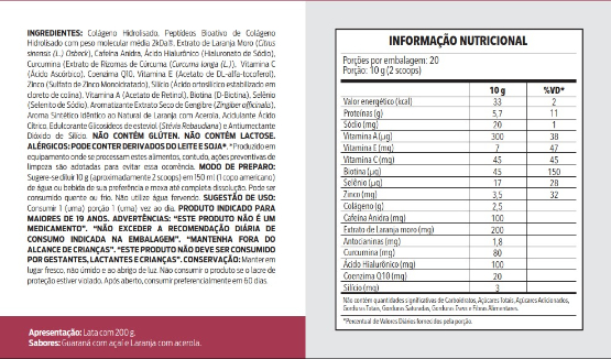 A combinação do Colágeno Verisol® com o Ácido Hialurônico auxilia na manutenção da pele, deixando-a mais firme e hidratada, além de fortalecer as unhas e cabelos. Enquanto isso, a Laranja Moro, a Cafeína e o Gengibre formam um poderoso trio antioxidante e termogênico, auxiliando nas atividades físicas e na manutenção de peso. Experimente já esse Super Lançamento da Bodyaction!
