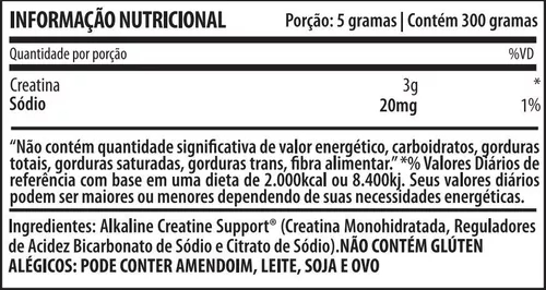 Alkaline Creatine Support* (Creatina Monohidratada, reguladores de acidez bicarbonato de sódio e citrato de sódio)