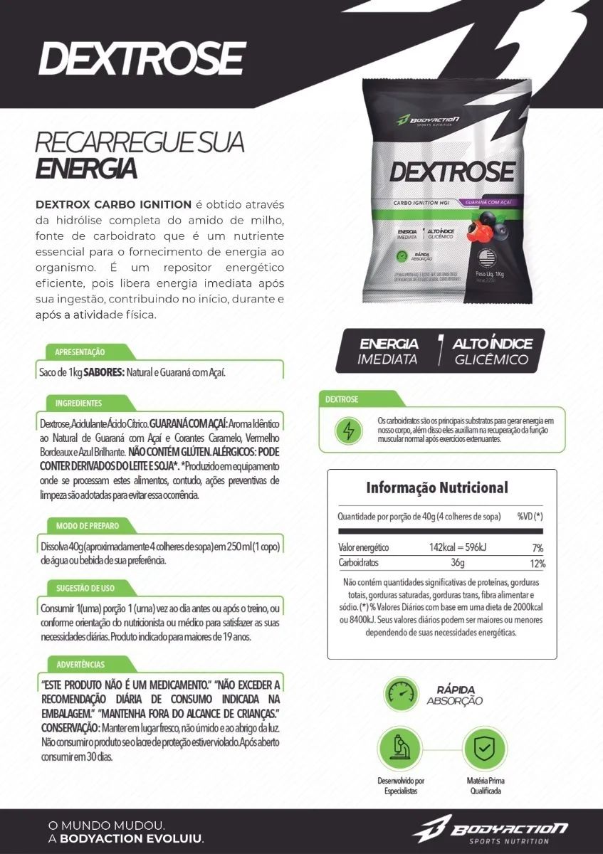 O Dextrox Bodyaction é obtido através da hidrólise completa do amido de milho, fonte de carboidrato que é um nutriente essencial para o fornecimento de energia ao organismo. É um repositor energético eficiente, pois libera energia imediata após sua ingestão, contribuindo no início, durante e após a atividade física.