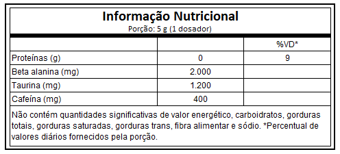 Sua fórmula contém ingredientes energéticos e neuroestimulantes capazes de criar as condições físicas adequadas à realização de treinos intensos, retardando o desgaste físico e mantendo o alerta mental do início ao fim.
