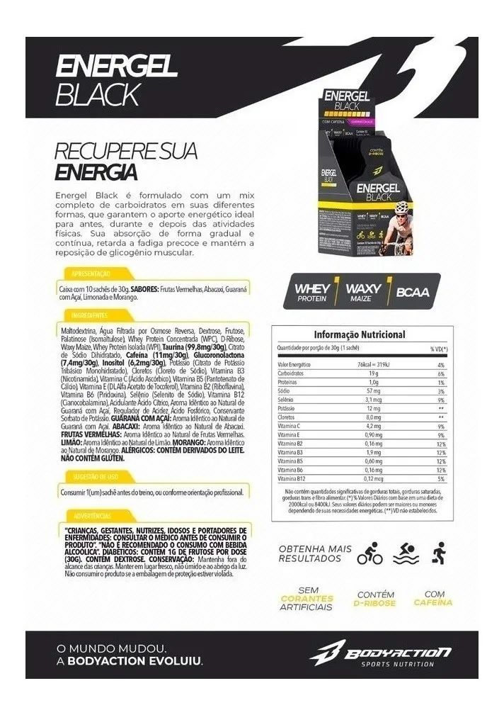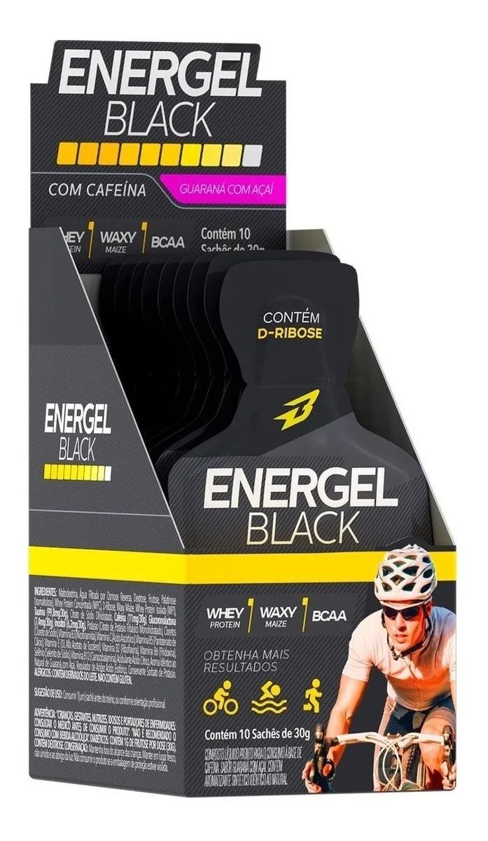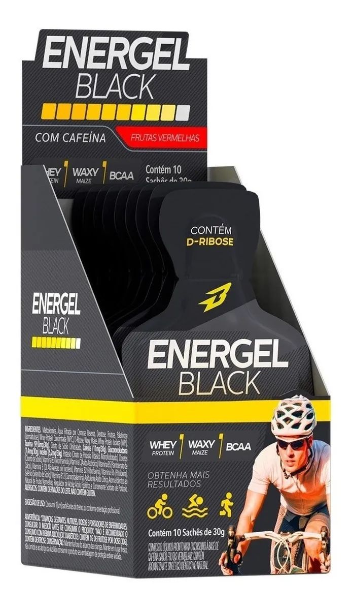 Energel Black está disponível em sachês de 30g, em formato gel, para você consumir quando e onde quiser.