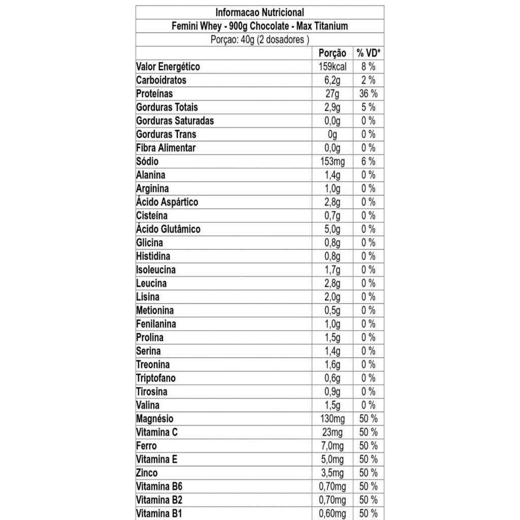 COMPOSIÇÃO DO ANÚNCIO 1x FEMINI WHEY – 900G – MAX TITANIUM DESCRIÇÃO DO ANÚNCIO “FEMINI WHEY As proteínas do soro do leite, também conhecidas como whey protein, são extraídas durante o processo de fabricação do queijo. Possuem alto valor nutricional, contendo alto teor de aminoácidos essenciais, de cálcio e de peptídeos bioativos do soro. Além disto, o Femini Whey contém a proteína isolada de soja, importante por ter em sua composição BCAA, glutamina e arginina. Ela não apenas ajuda no crescimento e na recuperação muscular, como também contribuí para o aumento do metabolismo e a perda de gordura. A soja, por causa da isoflavona que possui, também auxilia no combate aos radicais livres para favorecer o funcionamento do sistema imunológico. Femini Whey conta ainda com um complexo vitamínico com potencial para aumento da integridade da pele, fortalecimento de cabelos, unhas e combate a sintomas de TPM. Para um produto direcionado ao público feminino, ainda contém em sua formulação o colágeno hidrolisado, proteína considerada chave do organismo que assegura a coesão, elasticidade e regeneração da pele, cartilagens e ossos.Benefícios:-28g de proteína por porção;-Sem adição de açúcares;-6,2g de BCAA;-Com colágeno hidrolisado;-Alto teor de vitaminas e minerais (específicos para a integridade da pele, fortalecimento de cabelos, unhas e combate a sintomas de TPM);-Aumento da massa muscular;-Recuperação muscular pós-treino;-Alta quantidade de BCAA’s;-Fortalece o sistema imunológico;-Redução de gordura corporal.Sugestão de uso: Para o preparo de uma porção, adicione 2 dosadores (aproximadamente 40g) do produto em 150ml de sua bebida preferida (água mineral, leite desnatado, etc). Utilize de 1 a 2 porções ao dia, ou conforme orientação de nutricionista ou médico.Recomendações: Gestantes, nutrizes e crianças até 3 (três) anos, somente devem consumir este produto sob orientação de nutricionistas ou médicos.”