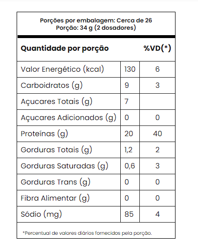 Proteína de soro do leite concentrada, peptídeos de colágeno hidrolisado, aroma sintético idêntico ao natural de doce de leite, cloreto de potássio, estabilizante goma xantana, edulcorantes: sucralose e acessulfame de potássio.
