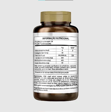 O colágeno tipo II não desnaturado auxilia na manutenção da função articular. 40 mg de colágeno tipo II não desnaturado; Condroitina; MSM; Ácido hialurônico; Vitamina D3.