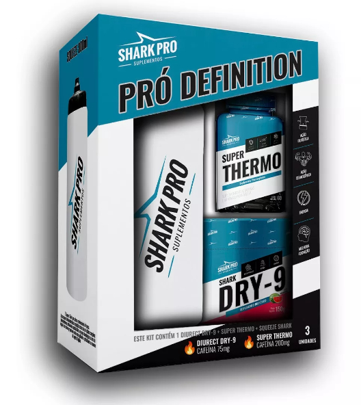 A Shark criou um kit com dois produtos mais o squeeze direcionado para a termogênese, diurese, emagrecimento, mais energia e maior desempenho para sua prática de exercício. Os dois produtos DRY-9 e SUPER THERMO fazem a combinação perfeita para atingirem seus resultados. Os produtos possuem um mix de ingredientes que usados de maneira conjunta potencializam os resultados.