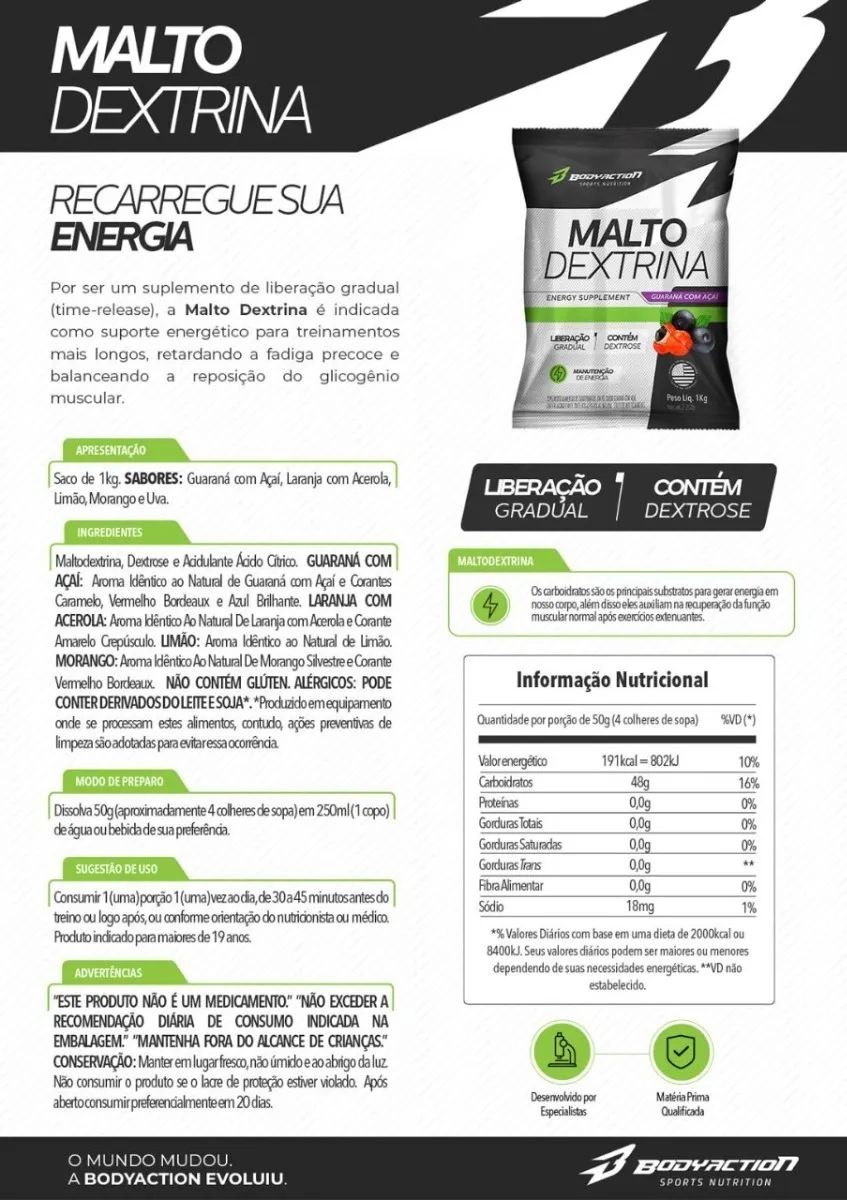 Informações Adicionais: Por ser um suplemento de liberação gradual (time-release), a Maltodextrin da Body Action é indicada como suporte energético para treinamentos mais longos, retardando a fadiga precoce e balanceando a reposição do glicogênio muscular.