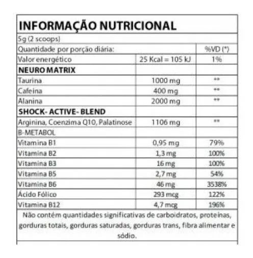 Água filtrada, L-carnitina, Taurina, Cafeína, Picolinato de Cromo, Aromatizante Gengibre em Pó, Extrato de Pimenta Preta, Aroma Idêntico ao natural de Maçã Verde, Conservantes Sorbato de Potássio, Benzoato de Sódio e Edulcorante Sucralose. ALÉRGICOS: CONTÉM DERIVADOS DE CRUSTÁCEOS (CARANGUEJO). PODE CONTER DERIVADOS DE PEIXE, MOLUSCOS (OSTRAS) E SOJA. NÃO CONTÉM GLÚTEN.