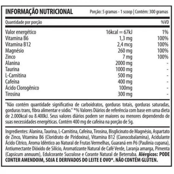 Alanina, Taurina, L-Carnitina, Cafeína, Tirosina, Bisglicinato de Magnésio, Aspartato de Zinco, Vitamina B6 (Cloridrato de Piridoxina), Vitamina B12 (Cianocobalamina), Acidulante Ácido Cítrico, Aroma Idêntico ao Natural de Frutas Vermelhas, Guaraná em Pó (Paulinia Cupana), Antiumectante Dióxido de Silício, Aromatizante Natural de Café Verde, Laranja Amarga, Pimenta (Capsium Annuum), Edulcorante Sucralose e Corante Natural de Beterraba.