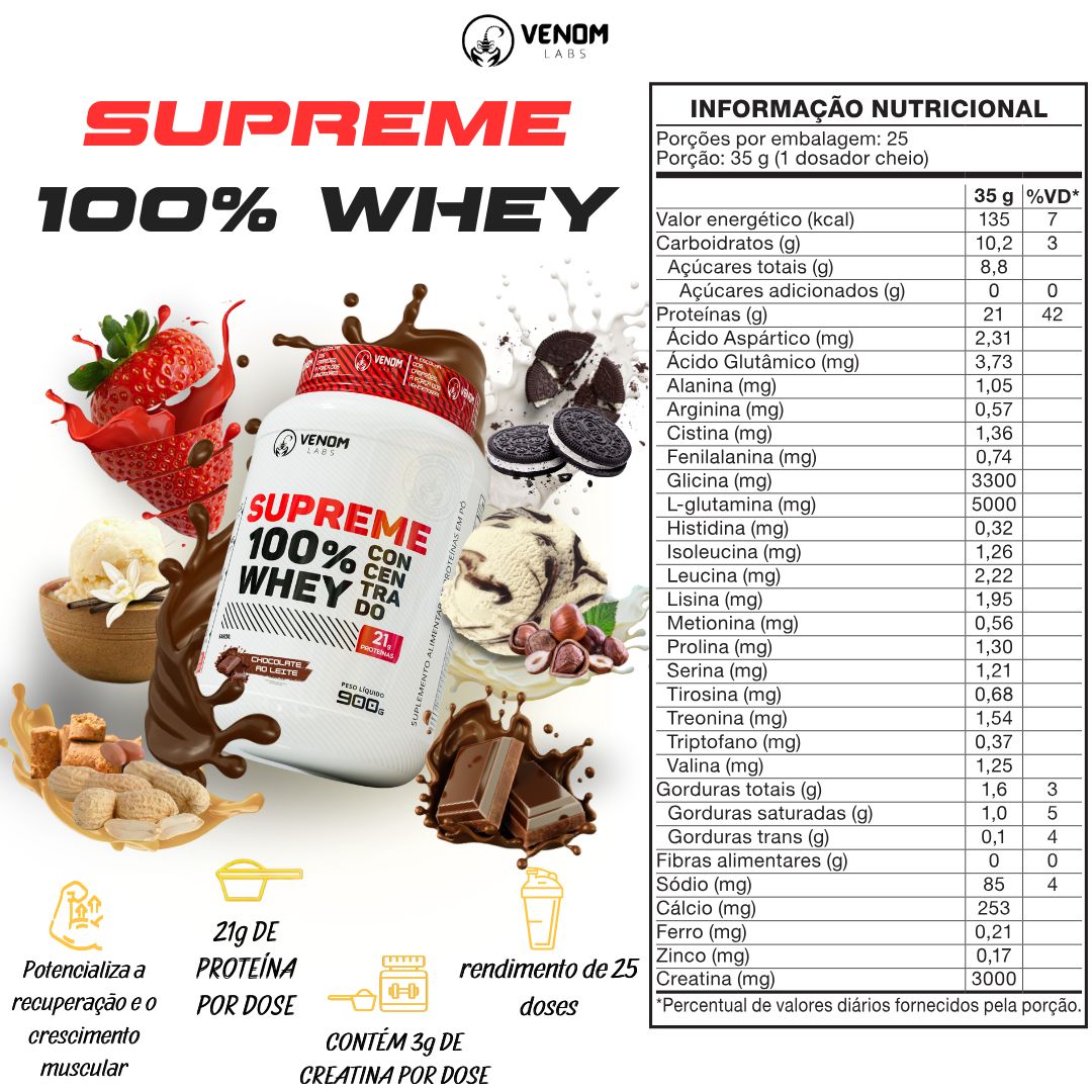 SUPREME WHEY 100% CONCENTRADO da Venom Labs é a escolha ideal para quem busca hipertrofia, recuperação muscular e desempenho superior. Com uma fórmula avançada e ingredientes estratégicos, ele oferece tudo o que seu corpo precisa para evoluir treino após treino.
