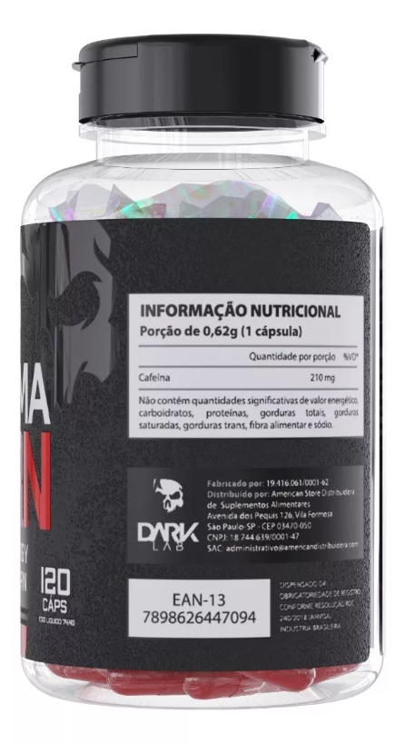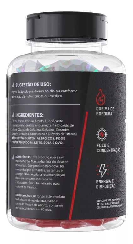 Cafeína Anidra, excipientes dióxido de silício, estearato de magnésio, veiculo cápsula: gelatina, água purificada, corantes artificiais amarelo de quinoleína, vermelho 40, azorrubina e corante inorgânico dióxido de titânio.