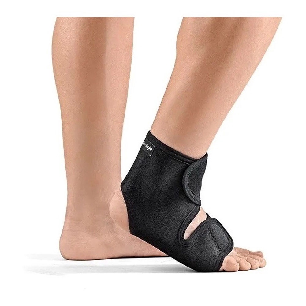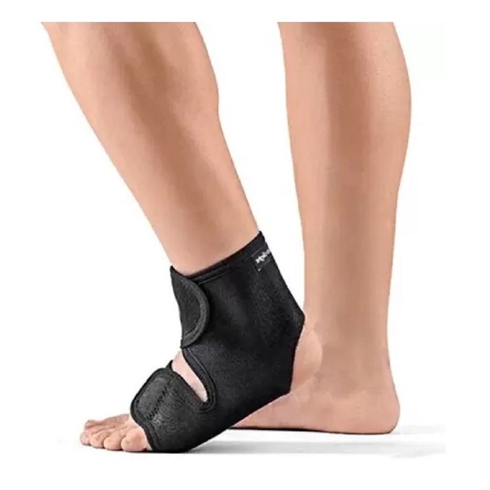Indicações Tratamentos de lesões agudas e crônicas; Entorses e contusões; Prevenção de lesões durante a prática de exercícios; Instabilidade articular e ligamentar; Tendinites, luxações, estresse muscular; Reabilitação de fraturas; Auxílio no tratamento fisioterapêutico. CONSULTE UM ESPECIALISTA. Instruções de Uso Coloque a órtese de maneira que o orifício fique no calcanhar com as abas para frente. Ajuste o produto através das abas com fecho aderente fechando uma no peito do pé e a outra no tornozelo conforme compressão adequada ao seu conforto. Composição Borracha de cloropreno revestida com tecido 100% poliamida.  Compressão na região do tornozelo; Melhora a sensação de estabilidade da articulação; Retém o calor devido ao material em neoprene; Auxilia no alívio da dor; Único – Ajustável | Tamanho Especial.