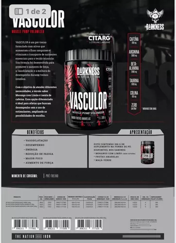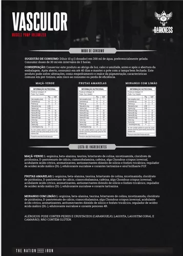 Chegou o novo Vasculor Darkeness, agora na versão em pó de 300g, desenvolvido para elevar seu desempenho ao máximo e proporcionar treinos mais intensos e produtivos. Este pré-treino poderoso foi formulado para quem busca energia explosiva, foco extremo e resistência incomparável durante os treinos.