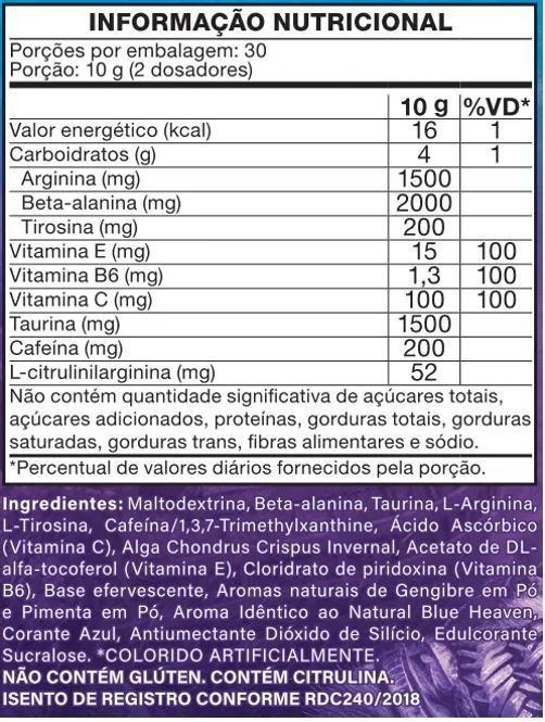 Maltodextrina, Beta- alanina, Taurina, Arginina,Taurina, L-carnitina, Tirosina, Cafeína, ácido ascórbico, Alga Chondrus Crispus invernal, Acetato de DL alfa tocoferol, cloridrato de piridoxina, base efervescente, aromas naturais de gengibre em pó e pimenta em pó, aroma idêntico ao natural de blue heaven, corante azul, antiumectante dióxido de silício e sucralose.