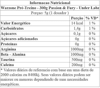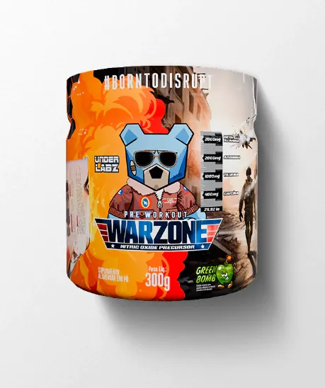 O Warzone 300g Under Labz é composto por ingredientes como: Cloridrato de L-Arginina, Beta-Alanina, Taurina, Cafeína, Extrato de Laranja Amarga.