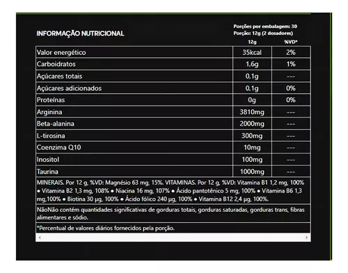 • Beta-alanina, taurina, taurato de magnésio, maltodextrina, L-tirosina, inositol, coenzima Q10, nicotinamida, pantotenato de cálcio, cloridrato de piridoxina, biotina, mononitrato de tiamina, riboflavina, ácido fólico, cianocobalamina